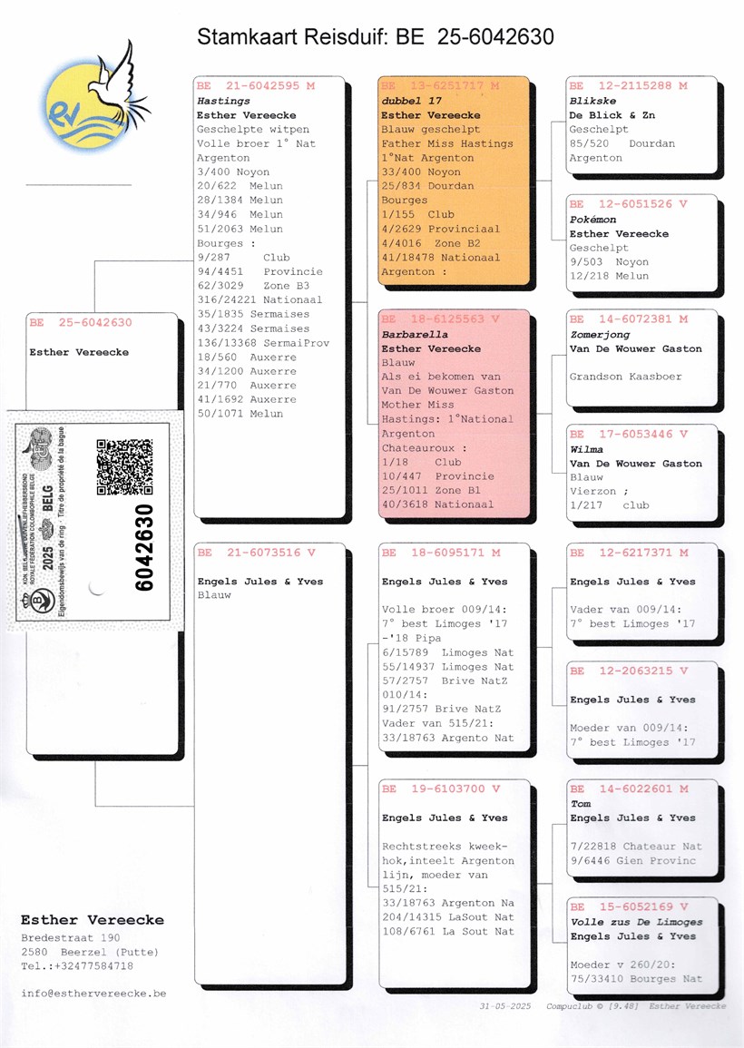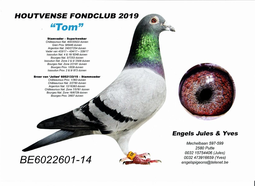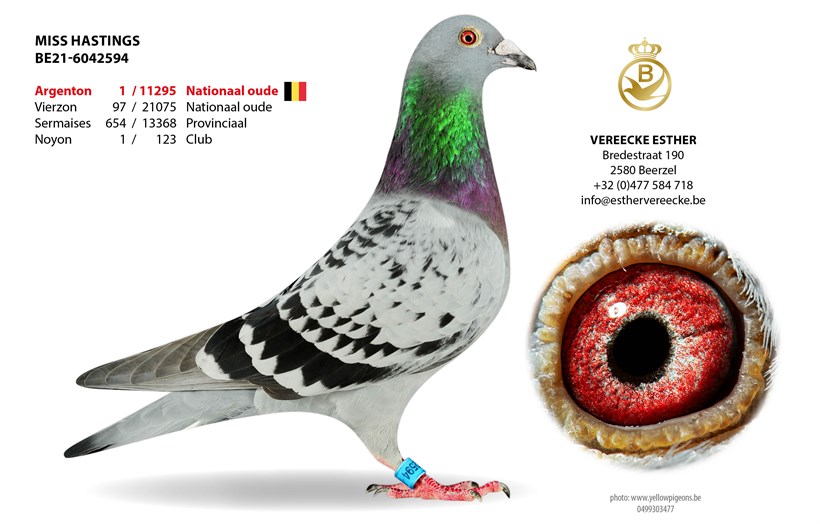 "Mister Hastings" full brother "Miss Hastings" 1. National Argenton (545 km) vs. 11.295 pigeons X "Blue Engels" grand daughter "Tom" Orig. Jules & Yves Engels !