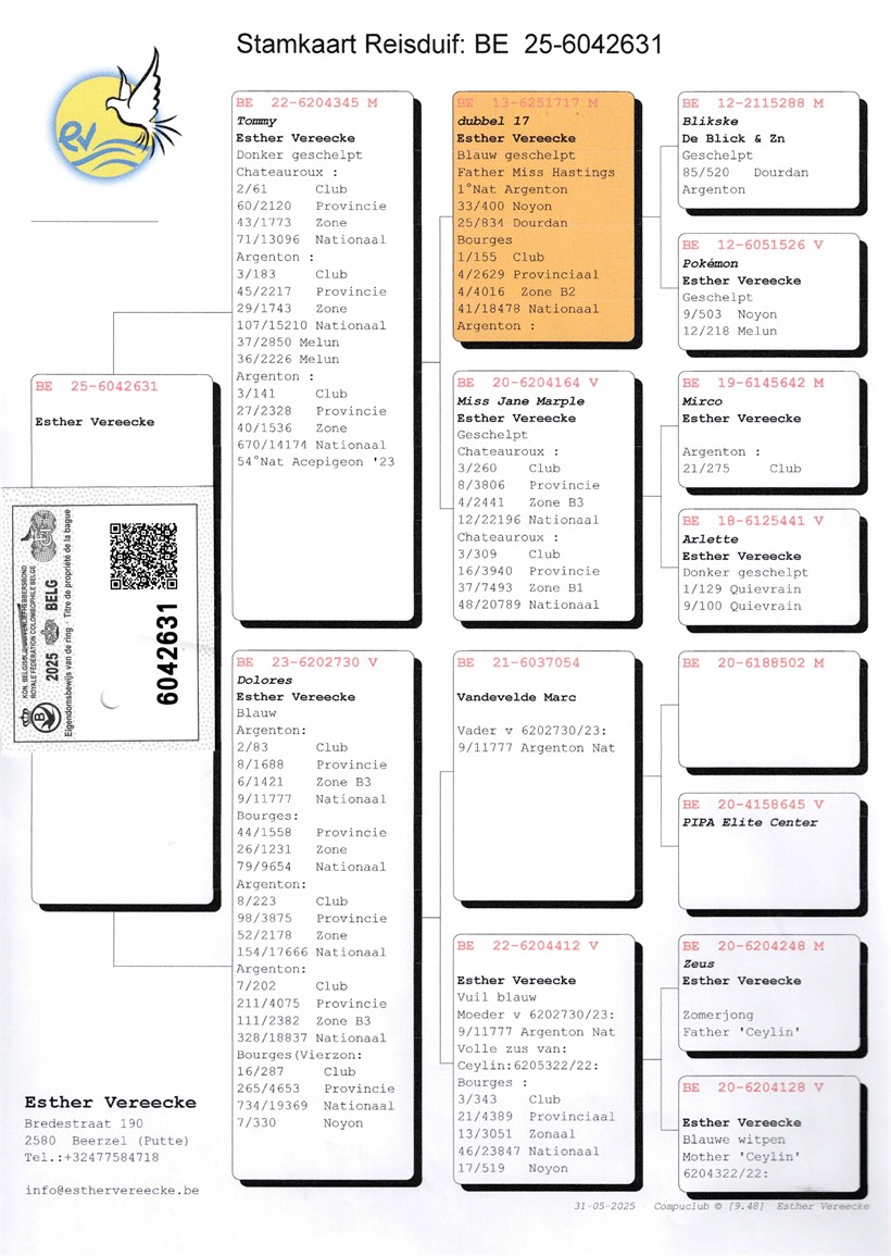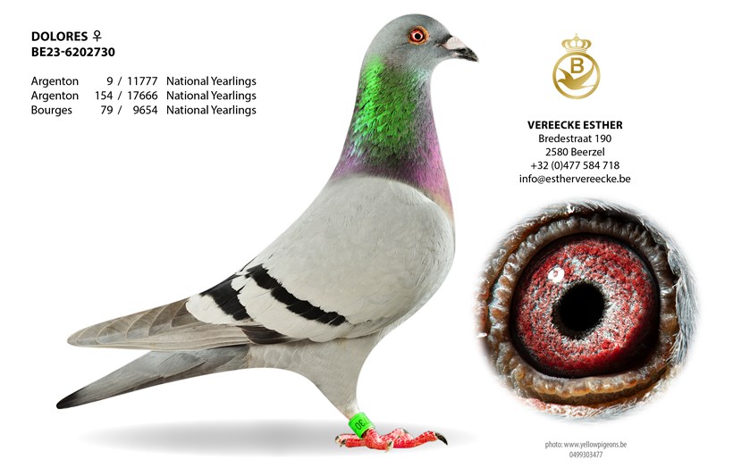 "Tommy" won 71. National Chateauroux vs. 13.096 pigeons (son super breeder "Dubbel 17") X super hen "Dolores" 9. National Argenton (545 km) vs. 11.777 pigeons !