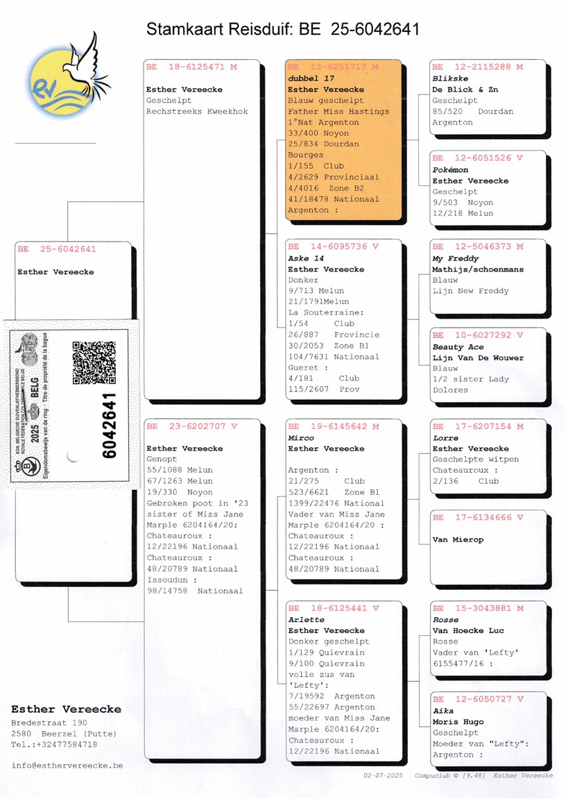 Half brother "Miss Hastings" 1. National Argenton (545 km) vs. 11.295 pigeons X sister "Miss Jane Marple" daughter of "Mirco" with "Arlette" sister super hen "Lefty" !