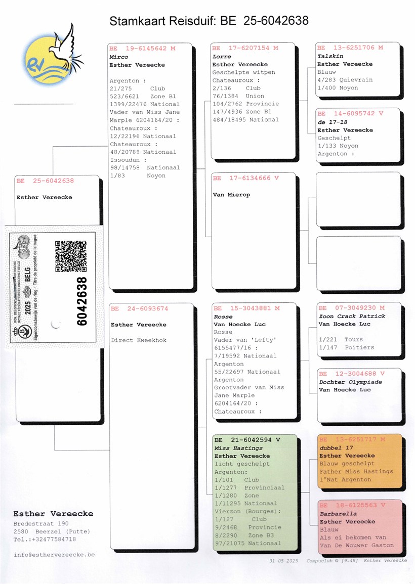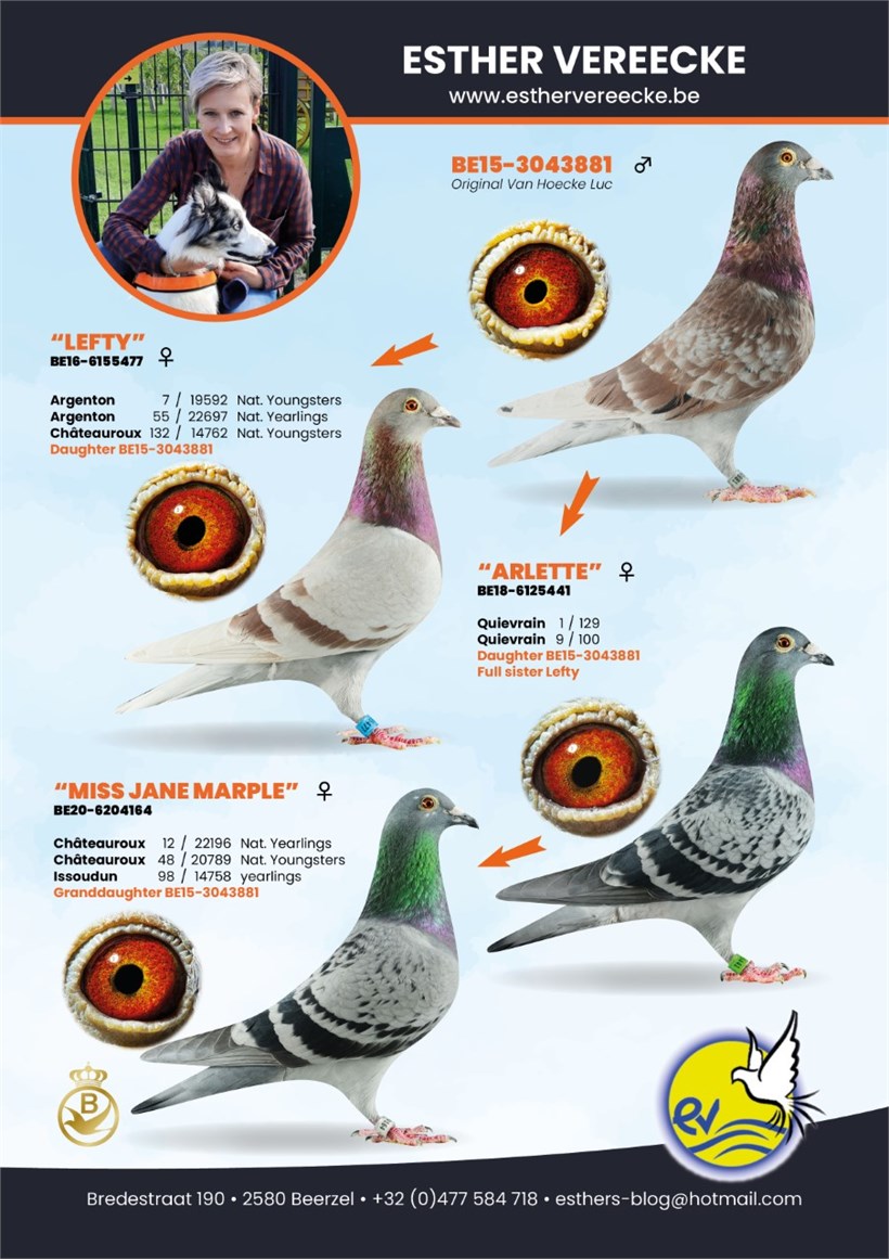 Half sister "Miss Jane Marple" won 12. National Chateauroux vs. 22.196 pigeons & 48. National Chateauroux vs. 20.789 pigeons ! "Mirco" x daughter "Miss Hastings" 1. National Argenton vs. 11.295 pigeons !