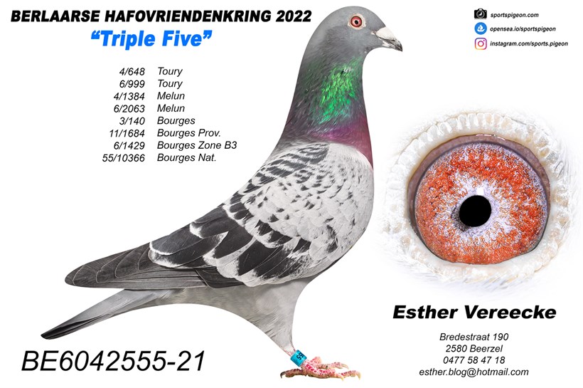 Ace cock "Triple Five" full brother "Miss Hastings" 1. National Argenton (545 km) vs. 11.295 pigeons X "Rosamund" 1. Provincial Vierzon (465 km) fastest vs. 4.663 pigeons ! 【“三个五”(亚精顿国家赛545公里11295羽冠军“哈斯廷斯小姐”全兄弟)X “罗萨蒙德”(维尔宗省赛465公里4663羽冠军)】