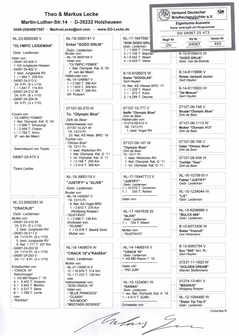 Son "Olympic Leideman" (grandson "Goed Grijs" 7 x 1. prize with daughter "Olympic Blue") X "Crackje" daughter "JUSTIFY" x "CRACK 19" with "RAISSA" ! 【“奥林匹克雷德曼”(“好花”孙代ד奥林匹克灰”直女)X“好手雌”(“三冠王”直子ד好手19”“莱莎”直女)】