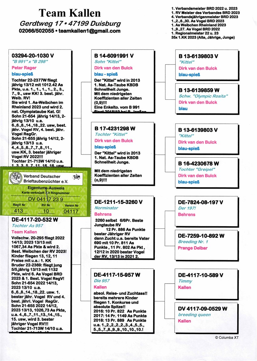 • Versand innerhalb Deutschlands je Taube € 75,- bei wöchentlichen Versand, ab 3 Tauben Versandpreis nach Anfrage