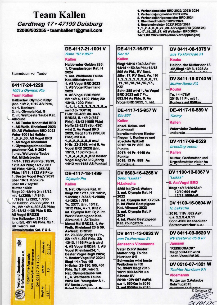 • Versand innerhalb Deutschlands je Taube € 75,- bei wöchentlichen Versand, ab 3 Tauben Versandpreis nach Anfrage