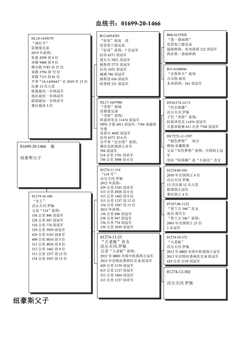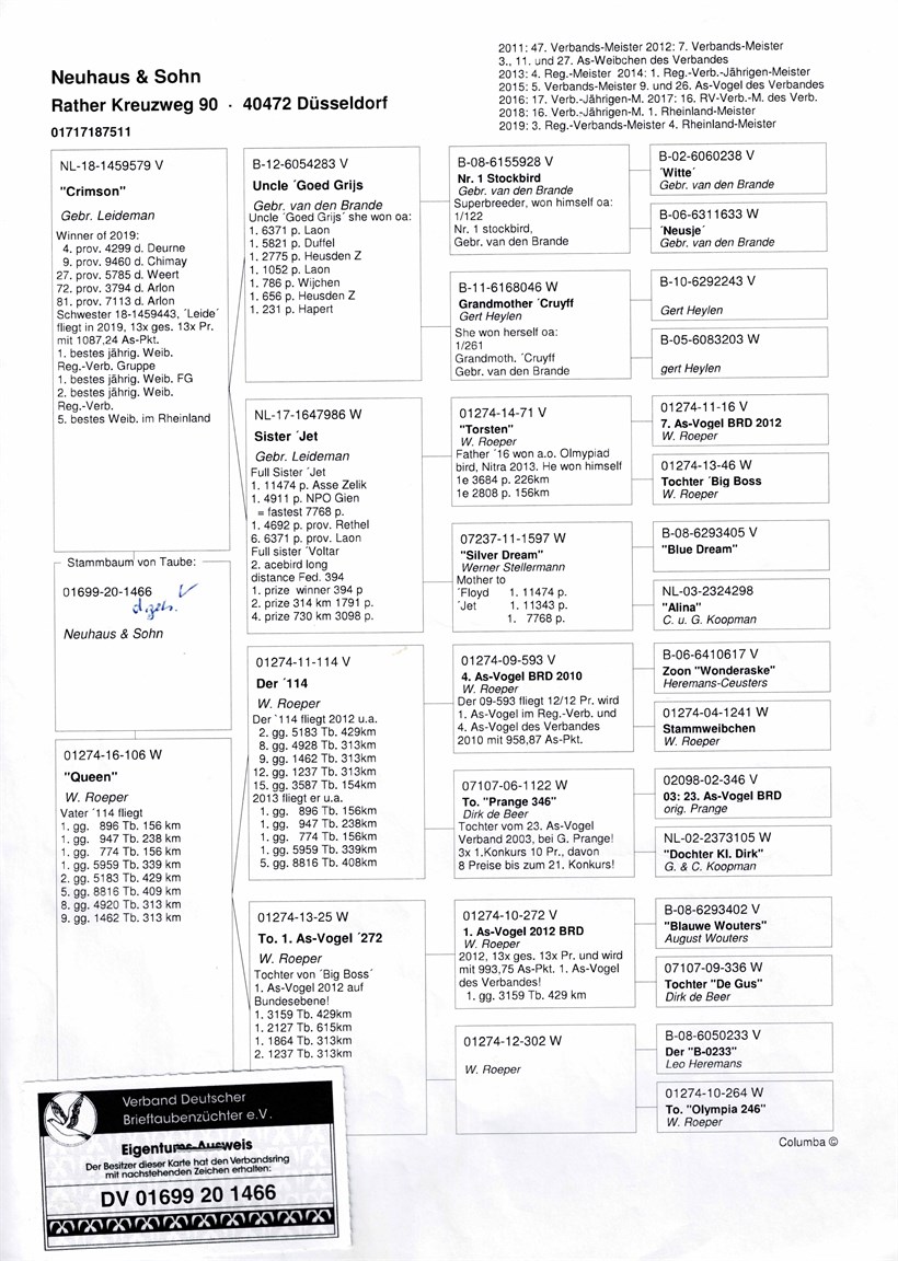"Crimson" son Uncle Goed Grijs 7 x 1. prize with sister "JET" X "Queen" daughter "Der 114" with daughter "BIG BOSS" 1. Ace cock Germany Orig. Wolfgang Roeper ! 【“深红号”(7次冠军“好花”叔叔ד杰特”姐妹)X“女王”(“114”×沃尔夫冈.罗佩的全国鸽王冠军“大老板”直女)】