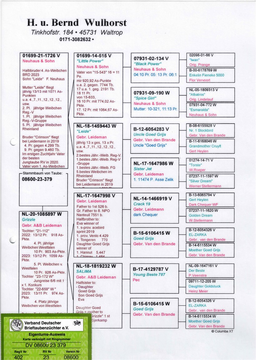 Half brother 4. National ace hen Germany from "Little Power" with super hen "Leide" 1. Provincial ace hen Yearlings X "Grizzle" from son "Crack 19" with doughter "Goed Grijs" 7 x 1. prize !