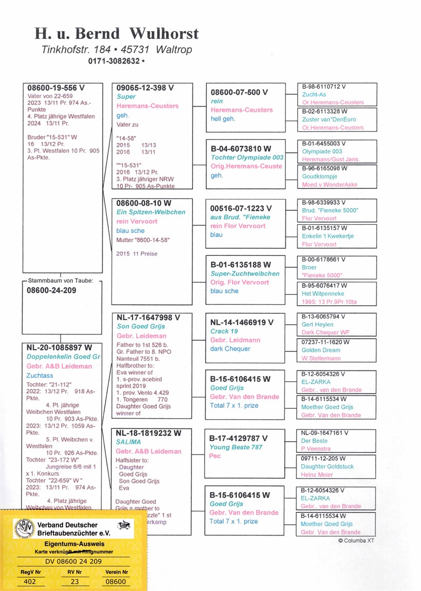 • Versand innerhalb Deutschlands je Taube € 75,- bei wöchentlichen Versand, ab 3 Tauben Versandpreis nach Anfrage