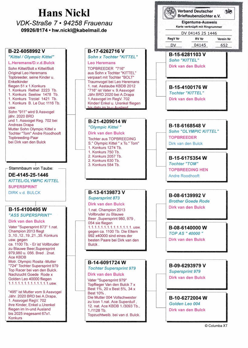 Family breeding "Kittel/Olympic Kittel" (Son x daugther "Kittel") with "Olympic Kittel" X "Ace Supersprint" daughter "Supersprint 873" with daughter "Supersprint 979" !