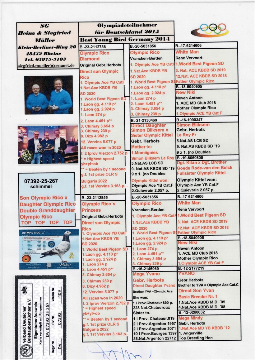 Total inbreed ! Son "Olympic Rico" 1. National Ace pigeon KBDB Speed & 1. Olympic Ace pigeon KBDB Speed & 1. World Best Speed pigeon Belgium X daughter "Olympic Rico" !