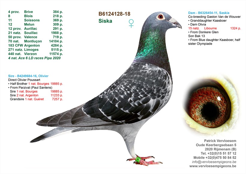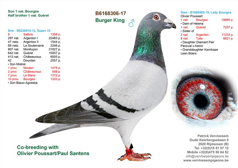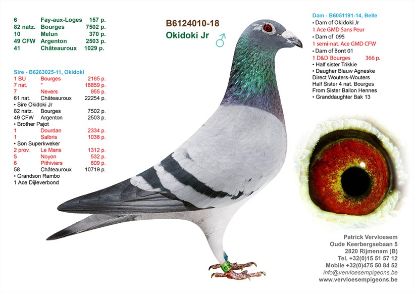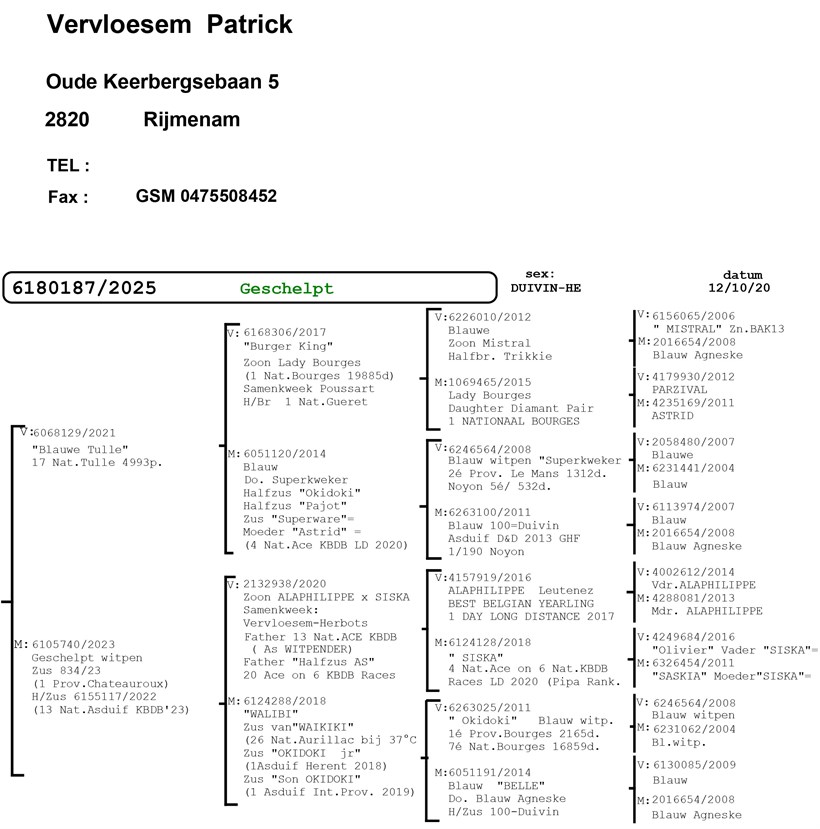 "Blauwe Tulle" 17. National Tulle vs. 4.993 pigeons ("Burger King" with half sister "Okidoki") X grand daughter "Okidoki" half sister 13. National ace pigeon KBDB !