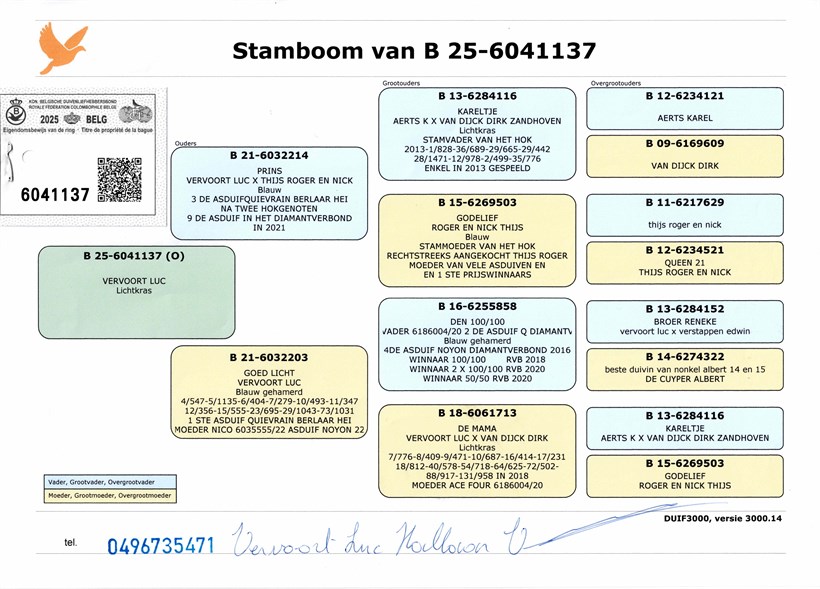 "Prins" 3. ace pigeon Quievrain Berlaar Heikant ("Kareltje" x "Godlief") X "Goed Licht" 1. ace pigeon Quievrain Berlaar Heikant form "Den 100/100" with "De Mama" ("Kareltje" x "Godlief")  mother "Ace Four"!