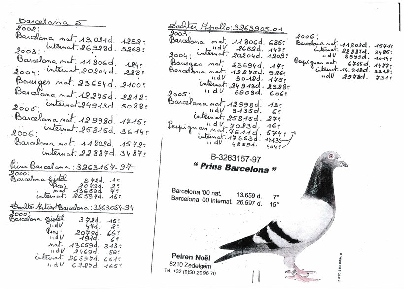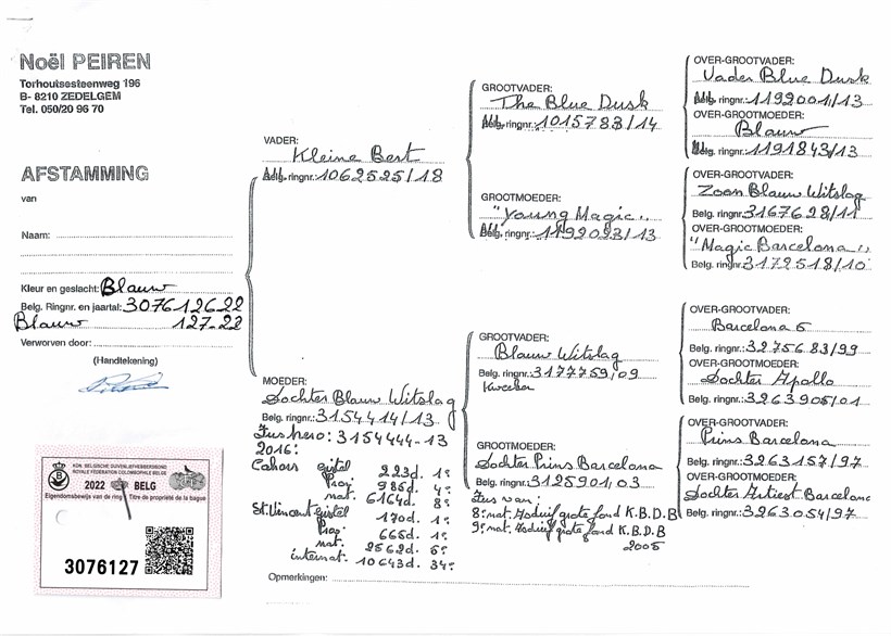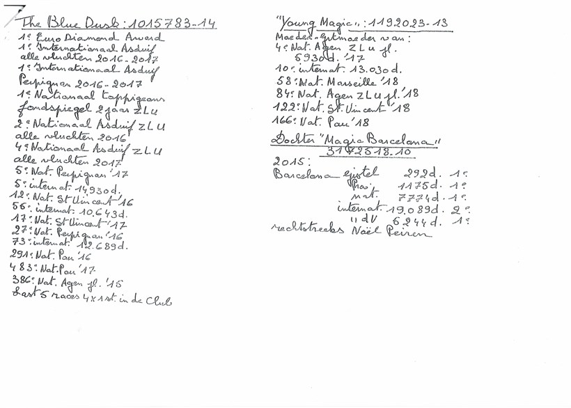 "Kleine Bert" grandson "Magic Barcelona" X daughter "Blauw Witslag" grand daughter "Barcelona 5" & "Prins Barcelona"!