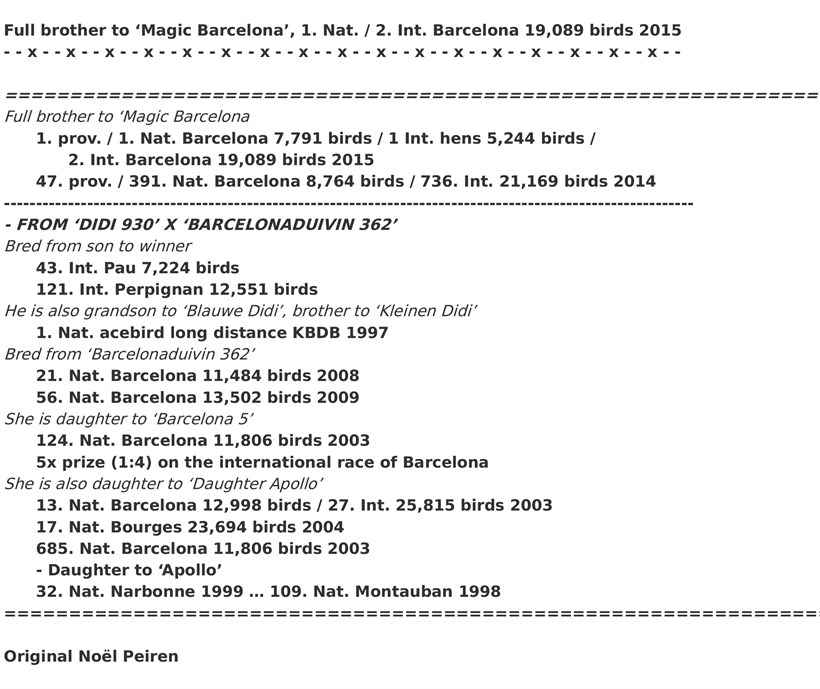 Inbreed !  Son x daughter full brother "Magic Barcelona" 1. National Barcelona vs. 7.774 pigeons & 2. International vs. 19.089 pigeons !