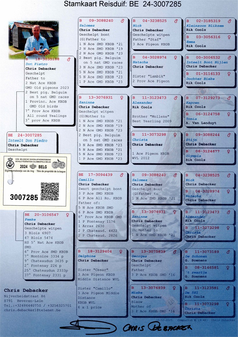 Inbreed "Don Pietro" !  "Don Pietro" father 2. National ace pigeon KBDB GMD (son super pair "Salomez" x "Zaninne") X daughter brother "Don Pietro" 5. National ace pigeon KBDB Small Middle Distance !