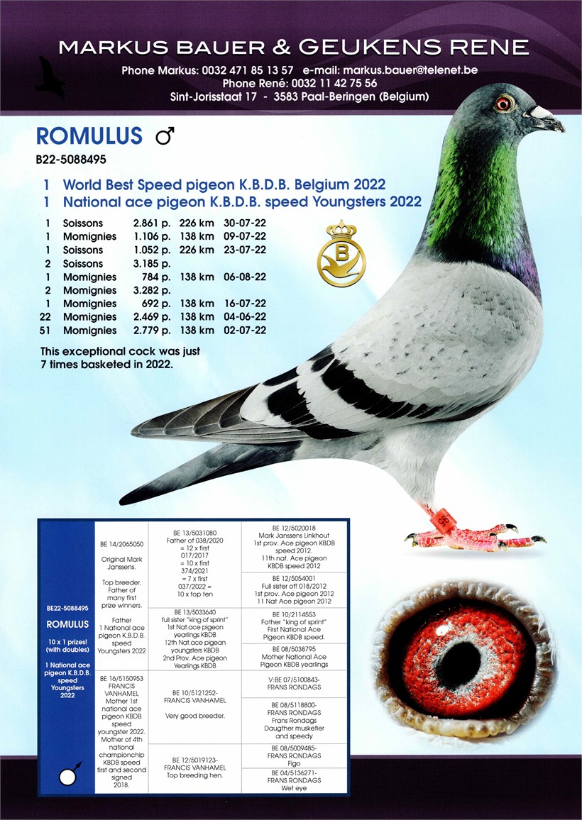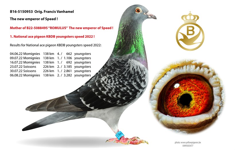 Daughter "Romulus" 1. National ace pigeon KBDB Speed Youngsters 2022 X "Zero Five" Andrè Roodhooft strain Hoefkens/Van Dyck/Gaby Vandenabeele !