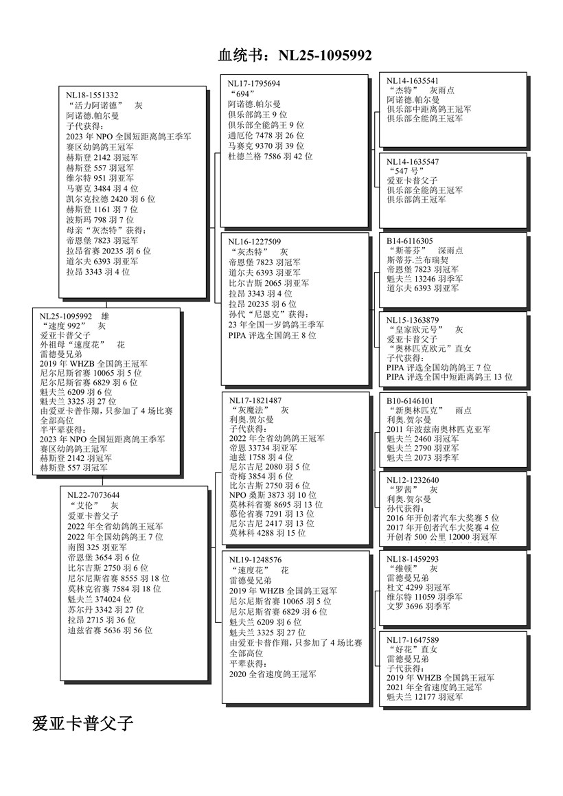 Son "Dynamic Arnold" 3. National Ace pigeon Speed NPO in 2023 X "Eileen" daughter of "Speedy Grizzle" 1. Nat. Ace pigeon Speed/Natour WHZB 2019 ! 【“活力阿诺德”(2023年NPO全国速度鸽王季军)X“艾伦”(2019年WHZB全国鸽王冠军“速度花”直女)】