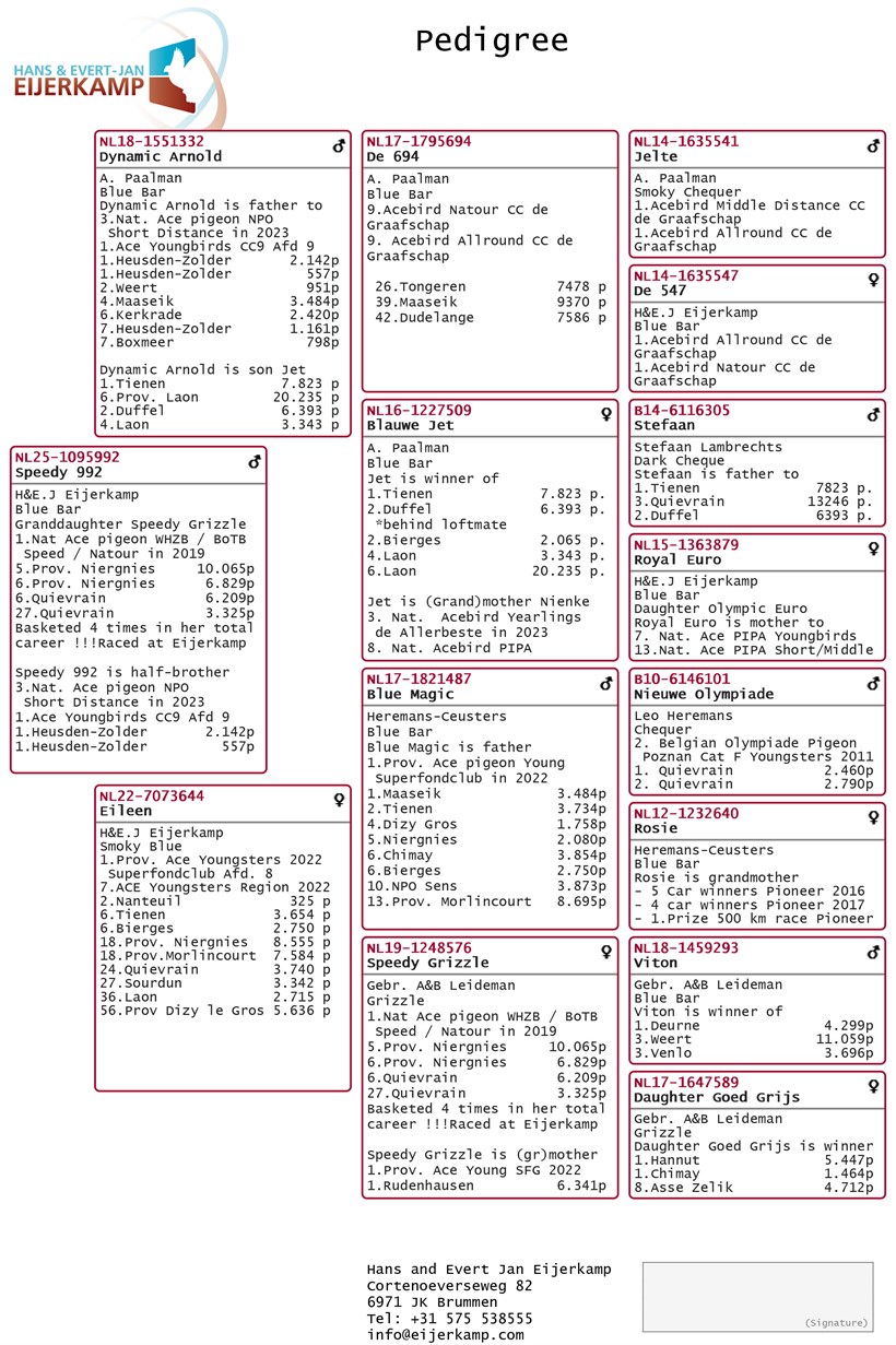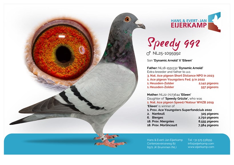 Son "Dynamic Arnold" 3. National Ace pigeon Speed NPO in 2023 X "Eileen" daughter of "Speedy Grizzle" 1. Nat. Ace pigeon Speed/Natour WHZB 2019 !