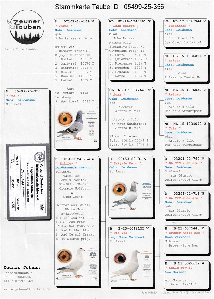 • Versand innerhalb Deutschlands je Taube € 75,- bei wöchentlichen Versand, ab 3 Tauben Versandpreis nach Anfrage