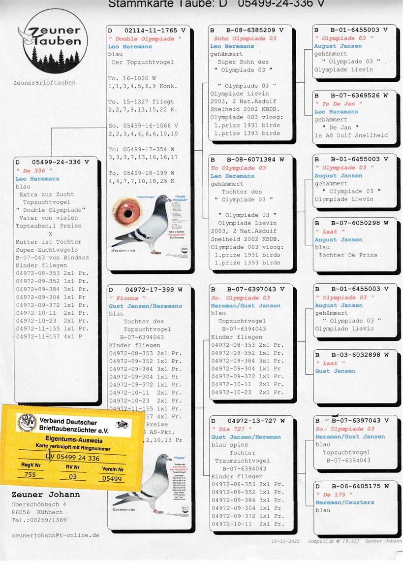 • Versand innerhalb Deutschlands je Taube € 75,- bei wöchentlichen Versand, ab 3 Tauben Versandpreis nach Anfrage