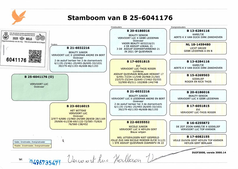 Inbreed ! "Beauty Junior" son "Beauty Senior" ("Karletje" with daughter "Goed Grijs") with "EVI" ace pigeon Berlaar Heikant X daughter "Beauty Junior" with "Nicole Junior" !