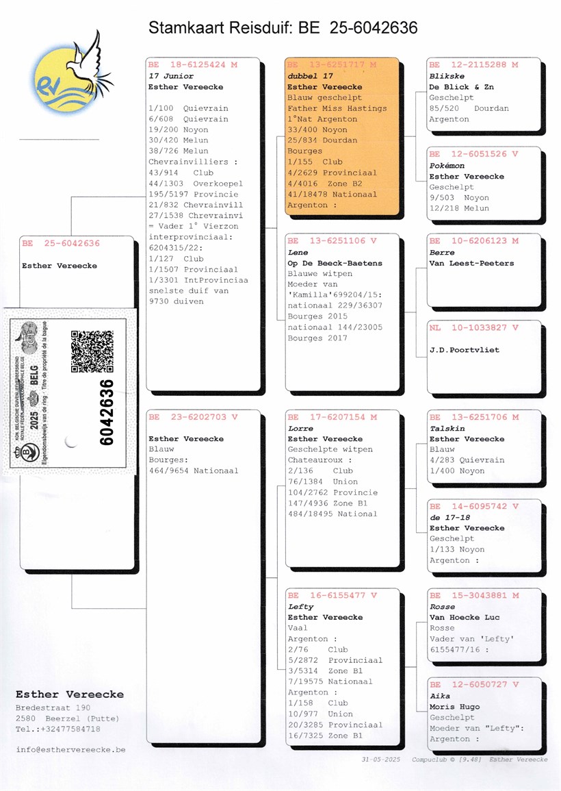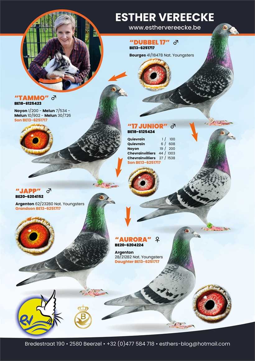 Half brother "Hermia" 1. Interprovincial Vierzon (465 km) ! Super breeder "17 Junior" X daughter "Lefty" 7. National Argenton (545 km) vs. 19.592 pigeons ! 3 x Top 100 National !