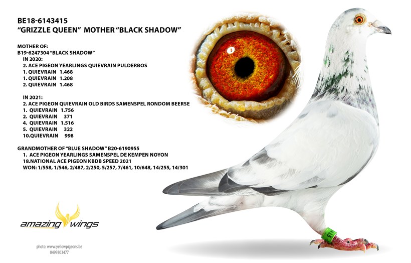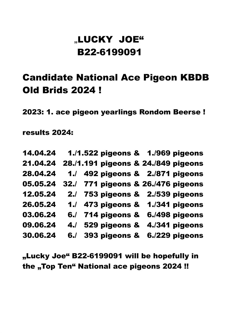 "Lucky Joe" 8. National ace pigeon KBDB Speed X daughter "Blue Shadow" 1. Ace Pigeon Yearlings Samenspel De Kempen & 18. National ace pigeon KBDB Speed !