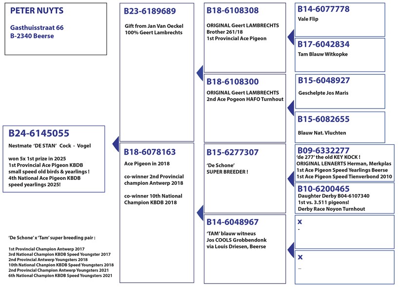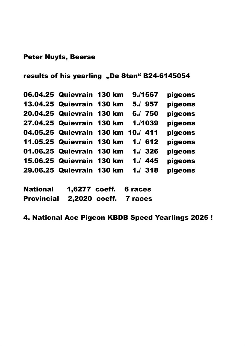 Nestmate ! Full brother "De Stan" won 5 x 1. prize in 2025 ! 1. Provincial Ace Pigeon KBDB Small Speed Antwerp & 4. National Ace Pigeon KBDB Speed Yearlings 2025 !