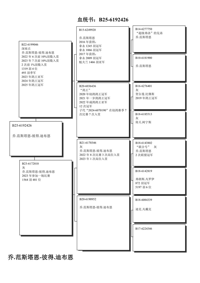 "Super ACE 46" was 2 x 1. Ace Pigeon ! Son of the super hen "AS Duif OORTS" won 12 x 1. prize X grand daughter "Tienverbonder" 2 x 1. prize ! 【“超级鸽王46”(12次冠军“鸽王号”直子)X“联合号”(2次联盟鸽王冠军)孙代】